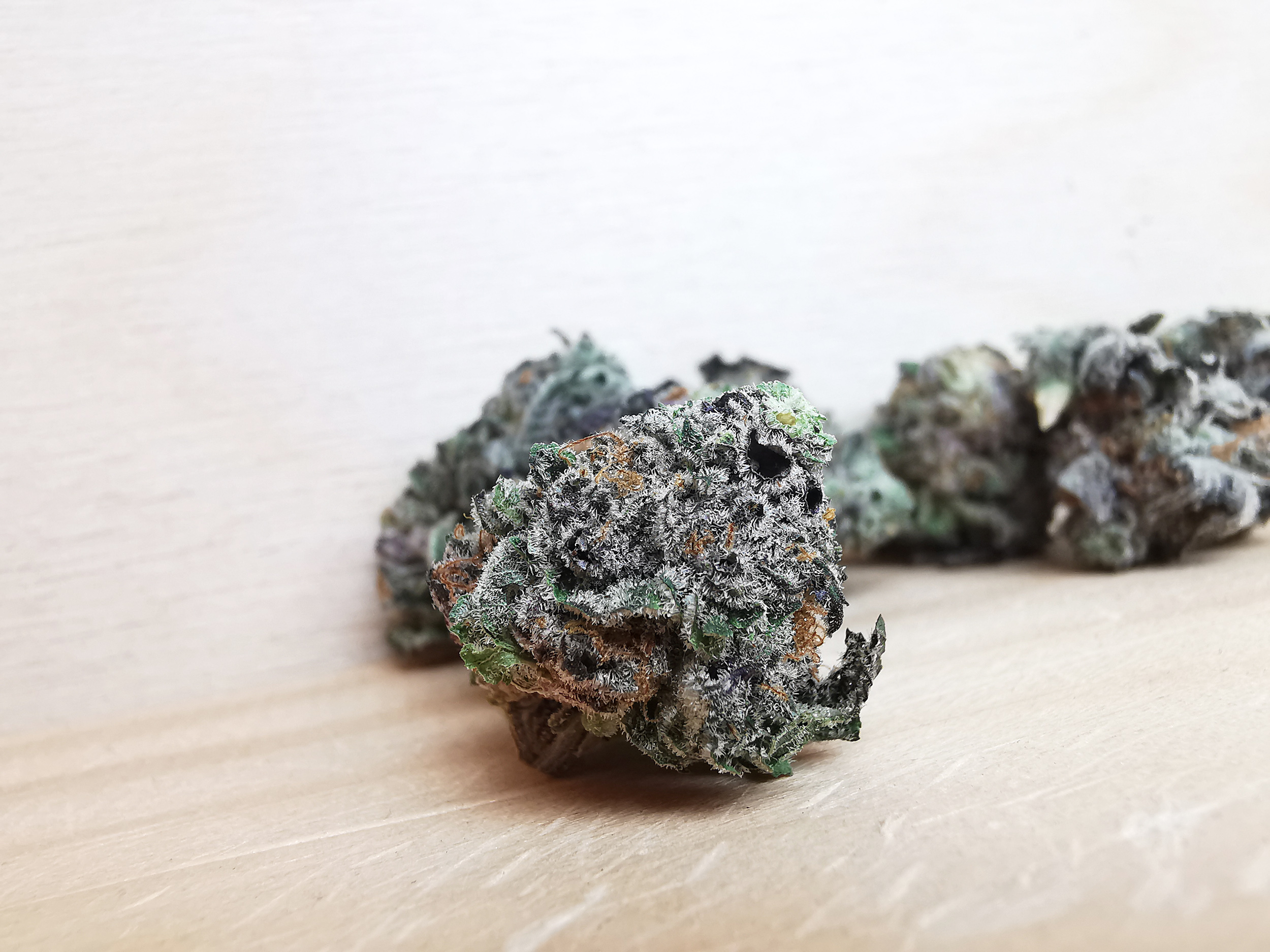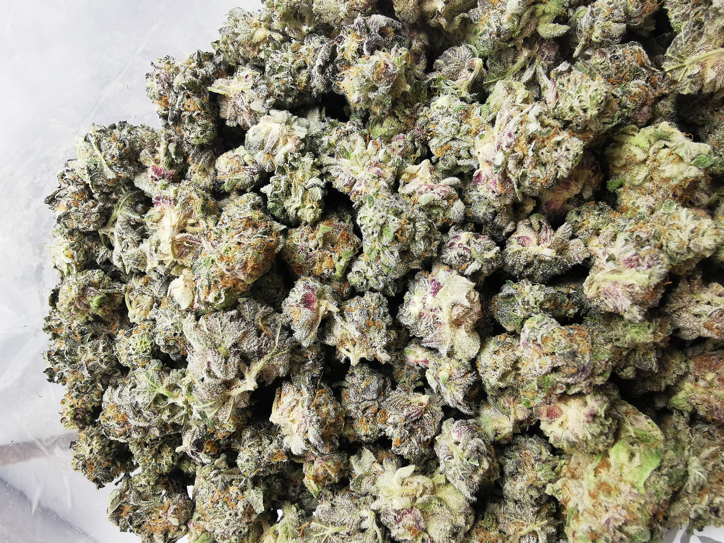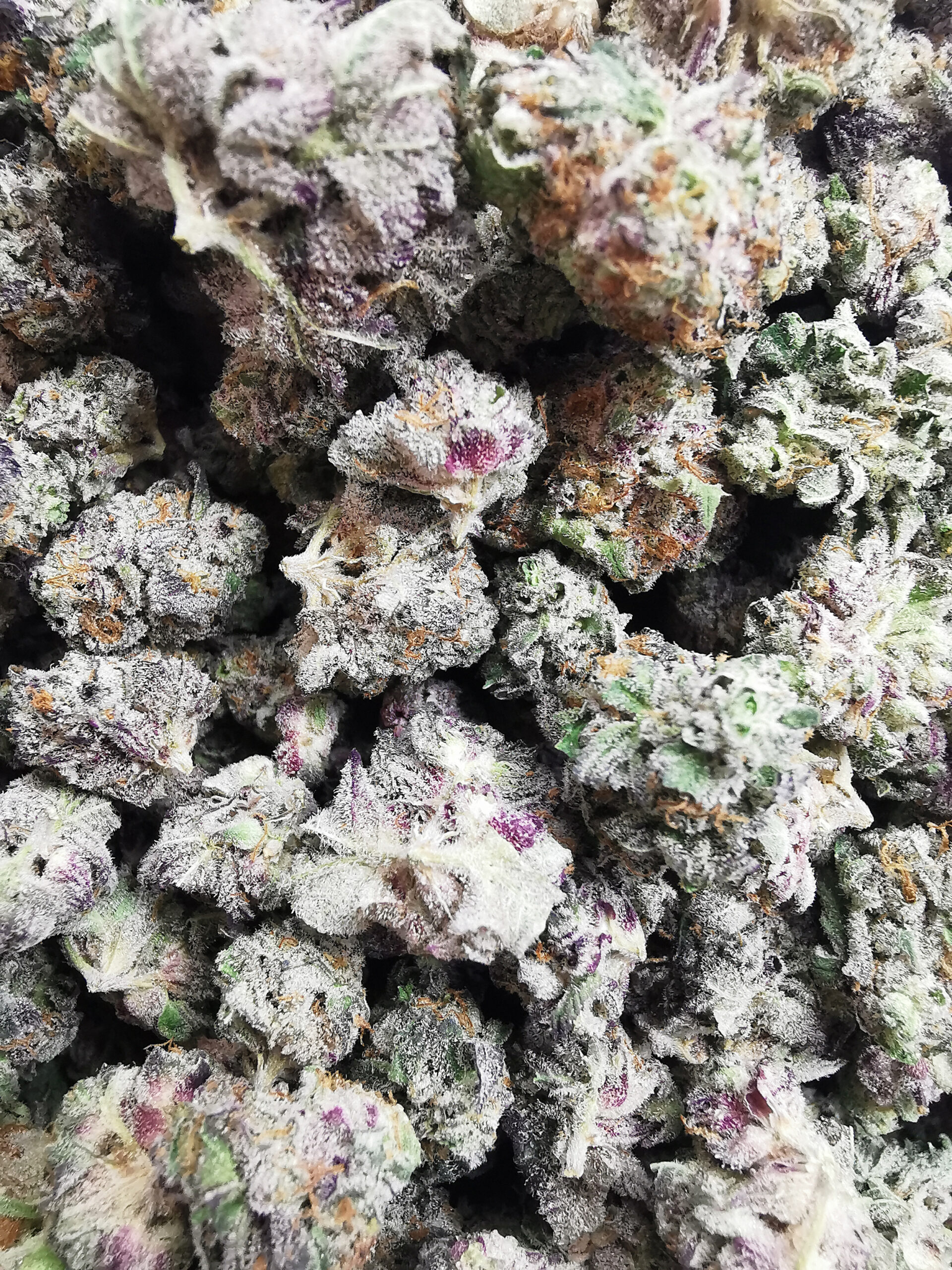 • Light green with hints of orange pistils and visible frost